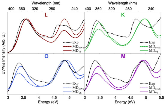 We finally move to the comparison between computed and experimental spectra, the latter reproduced from Refs. [28,67]. Such a comparison is shown in Figure 9. The experimental absorption spectrum of each molecule is characterized by two main peaks, the first lying at about 3.4 eV (365 nm) for K, Q, and M and 3.6 eV (345 nm) for L. The second peak is placed in the region 4.7–5 eV, and has a different shape for each flavonoid. In particular, for L and M, two peaks are present, probably due to vibronic coupling [84,85,86]. In addition, for L and Q, the first peak is the most intense one, whereas the opposite holds for K. For M, the intensities of the two bands almost coincide.