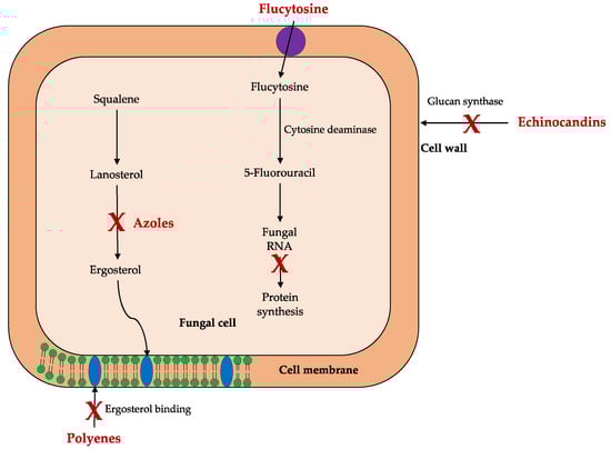 In the treatment of systemic mycoses, antifungals can be limited to four classes—polyenes, azoles, flucytosine, and echinocandins—in which they are distinguished by the mode of action (Figure 1), bioavailability, formulation, pharmacological interactions, and adverse effects [11,19].