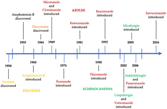 Figure 2 represents the year of discovery and/or introduction to the market of the different antifungals. At the moment, no new class has been approved by the European Medicine Agency (EMA) or the Food and Drug Administration (FDA), which poses a problem, because the current antifungals agents are not sufficiently active and safe, and they exhibit some toxicity and undesirable adverse effects [10,13]. The appearance of a second generation of azoles and, more recently, of echinocandins are two important milestones in the efficacy of antifungal therapy. The discovery of new antifungal agents has mainly been associated to the screening of large libraries of small molecules of natural, synthetic, or semi-synthetic products [10,11,13].
