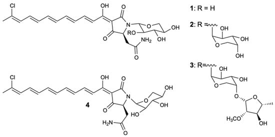 Aurantosides belong to a class of molecules produced by sponges of the genera Theonella, Homophymia, and Siliquariaspongia, which chemically present a tetramate ring with a mono- or dichlorinated long conjugated polyene chain and a N-glycosidic portion of one to three monosaccharides [30,31]. The study of the sponge Theonella swinhoei resulted in the extraction of three known aurantosides G–I (1–3) and a new aurantoside J (4) (Figure 3), which were tested for antifungal activity against C. albicans, C. glabrata, C. parapsilosis, C. tropicalis, and Fusarium solani. Compound 1 demonstrated moderate inhibition against all strains with MIC90 = 4–16 mg/L, and compound 3 was the only one that exhibited potent action with MIC90 values of 0.125–0.5 and 2 mg/L for Candida spp. and F. solani, respectively. Given the results obtained from compound 3, it was found that the three sugar chains attached to the tetramate ring by the nitrogen atom, as well as the C18 polyene chain, were important descriptors for inhibiting the growth of the five fungal strains [30].