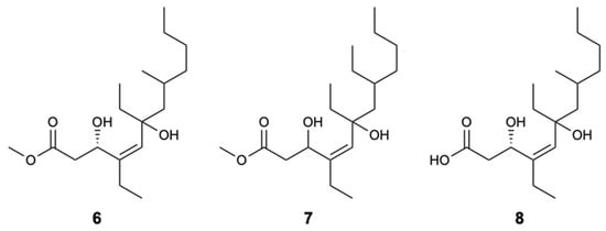 Three new linear polyketides called woodylides A–C (6–8) (Figure 5), collected on the Xisha islands in the China Sea from the sponge Plakortis simplex, were evaluated for their antifungal activity against C. albicans, C. neoformans, Nannizzia gypsea (formerly Microsporum gypseum), and Trichophyton rubrum, with AmB and fluconazole as positive controls. Compounds 6 and 8 exhibited moderate action with IC50 values of 3.67 and 10.85 mg/L against C. neoformans, respectively, unlike compound 7, which was not active. For the remaining fungi, compounds 6 and 8 showed weak activity and due to the lack of compound 7, it was not possible to test their antifungal inhibition [32].
