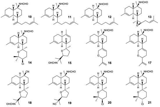 Seven new formamido-diterpenes, cavernenes A–D (10–13), kalihinenes E,F (14,15), and kalihipyran C (16), along with five known compounds, kalihipyran A (17), 15-formamidokalihinene (18), 10-formamido-kalihinene (19), and kalihinenes X,Y (20,21) (Figure 7), were isolated from the sponge Acanthella cavernosa. All compounds were tested for antifungal activity against C. albicans, C. glabrata, C. parapsilosis, A. fumigatus, C. neoformans, N. gypsea, and T. rubrum. Ketoconazole was used as a positive control with MIC ≤ 0.25 mg/L for all the tested strains. Compound 18 inhibited the growth of N. gypsea and T. rubrum with MIC values of 8 and 32 mg/L, respectively, and compound 19 showed action against C. albicans, C. neoformans, N. gypsea, and T. rubrum at concentrations of 8, 8, 8, and 4 mg/L, respectively. Given the results obtained, it was found that the isonitrile group is relevant for antifungal activity [34].