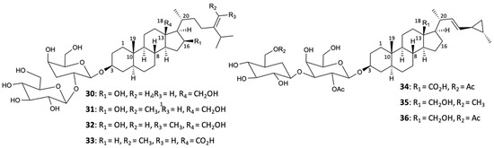 Until 2017, about 70 saponins were isolated from sponges, in which some of them, when submitted to different bioassays, revealed biological activities of great interest. The first study of the sponge Poecillastra compressa, by Bowebank in 1866, allowed finding seven new compounds, poecillastrosides A–G (30–36) (Figure 9). Later, these steroidal glycosides were tested for their ability to inhibit the growth of the fungus A. fumigatus, in which only compounds 33 and 34 exhibited activity with MIC90 values of 6 and 24 mg/L, respectively, concluding that the carboxylic acid present in C-18 plays an essential role in antifungal action [36].