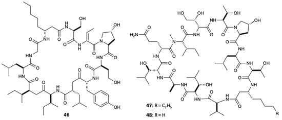 Filamentous marine cyanobacteria are one of the sources of bioactive secondary metabolites that naturally gain a lot of popularity in the study of marine natural products. Currently, there are numerous compounds from strains of cyanobacteria, mainly from the genera Lyngbya, Oscillatoria, and Symploca [41]. Lobocyclamides A–C (46–48) (Figure 13) are peptides isolated from Lyngbya confervoides that revealed significant activity against C. glabrata and C. albicans, in which the compounds 46 and 47 showed MIC values of 91 and 30–100 mg/L, respectively. The existence of mixtures consisting of compounds 46 and 47 (1:1) allowed investigating an important synergistic effect with great antifungal activity (MIC = 10–30 mg/L) compared to any of the pure isolated compounds [42].