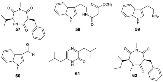 The chemical study of the tunicate-derived fungus Penicillium spp. CYE-87 resulted in the extraction of a new compound with the 1,4-diazepane skeleton, terretrione D (57), together with the five known ones, methyl-2-([2-(1H-indol-3-yl)ethyl]carbamoyl)acetate (58), tryptamine (59), indole-3-carbaldehyde (60), 3,6-diisobutylpyrazin-2(1H)-one (61), and terretrione C (62) (Figure 16). Of all the isolated compounds, only compounds 57 and 62 were moderately active against C. albicans with MIC = 32 mg/L [46].