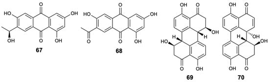 In the intertidal zones of the Yellow Sea in Qingdao, China, 141 strains of fungi were discovered from various marine plants, especially Alternaria sp. and Fusarium sp. Since these species are associated with metabolites with different biological activities, the selection of F. equiseti and Alternaria spp. from a screening of 31 identified strains led to the extraction of two new anthraquinone derivatives 67 and 68, and two perylenequinones, stemphyperlenol (69) and alterpeylenol (70) (Figure 18). The compounds were tested for antifungal activity against a wide spectrum of six pathogenic fungi: Alternaria alternata, Alternaria brassicicola, Phytophthora parasitica var. nicotianae, Diaporthe medusaea, A. niger, and Pestallozzia theae. Compounds 67 and 68 demonstrated moderate action under Pestallozzia theae with MIC = 31.3 mg/L, while compound 69 inhibited not only the growth of Pestallozzia theae, but also of Alternaria brassicicola with MIC values of 7.81 and 125 mg/L, respectively, in which they were identical to the positive control, carbendazim [48].
