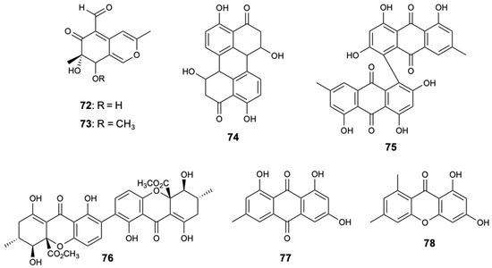 Two xanthones and structurally-related compounds, 7-epiaustdiol (72), 8-O-methylepiaustdiol (73), stemphyperylenol (74), skyrin (75), secalonic acid A (76), emodin (77), and norlichexanthone (78) (Figure 20), were isolated from the endophytic fungus Talaromyces spp. ZH-154, associated with mangrove plants, Kandelia candel (L.) Druce, collected in the South China Sea. All compounds were tested for antifungal inhibition against C. albicans, A. niger, and F. oxysporum f. sp. cubense, with nystatin used as a positive control. Compound 76 showed potent antifungal activity against all fungal strains tested. Notably, this compound showed inhibitory activity to A. niger with MIC = 6.25 mg/L, which is lower than nystatin (MIC = 25.0 mg/L) [50].