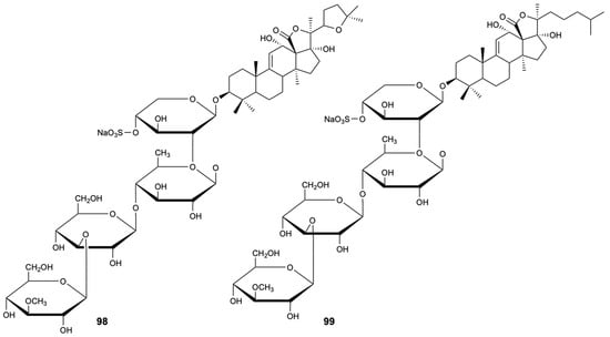 Two triterpenoid glycosides, holothurin A (98) and echinoside A (99) (Figure 24), were isolated from sea cucumber holothurian Pearsonothuria graeffei from the Red Sea, Egypt. The partial crude and purified extract from sea cucumber containing mainly these compounds was screened for antifungal activity against three clinical isolates of C. albicans (Candida 580, Candida 581, and Candida MEO47228), and the purified fraction showed good antifungal activity (24 h LC50 = 10 mg/L) [54].