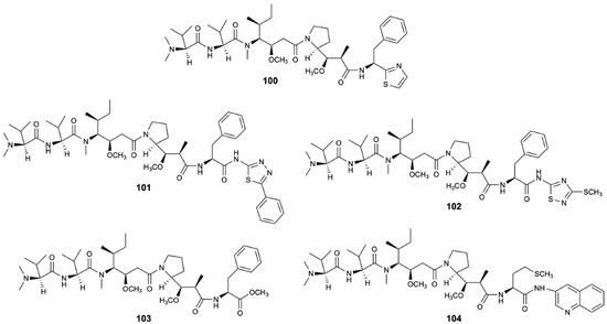 Dolastatin 10 (100) (Figure 25) is a natural product isolated from the Indian Ocean from the sea hare Dolabella auricularia. At the moment, studies have shown that dolastatin 10 and its derivatives are essentially derived from the sea hare’s diet of marine cyanobacteria, in particular Symploca sp. [55]. This linear peptide of three unique amino acid units proved to be able to inhibit the microtubules assembly and tubulin-dependent guanosine triphosphate binding by interfering in the formation of tubulin and thus interrupting cell division by mitosis and inducing apoptosis. Dolastatin 10 (100) and four other analog peptides (101–104) (Figure 25), obtained from 100 by structural modifications, showed specific fungicidal activity against ATCC strains and clinical isolates (including fluconazole-resistant strains) of C. neoformans with MIC50 = 0.195 mg/L and MIC90 = 0.39 mg/L [56,57].