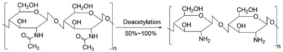 Even though chitin possesses the above-mentioned favorable functional feature, the poor solubility [10] limits its application in the pharmaceutical field. Researchers have turned their attention to chitosan (CS), a deacetylated derivative of chitin [11] (Figure 1). Chitosan is a random copolymer comprising d-glucosamine (the deacetylated ones) and N-acetyl-d-glucosamine units. The proportion of the d-glucosamine units defines the degree of deacetylation. A deacetylation degree reaching 50% implies the generation of chitosan; otherwise, the copolymer is still chitin [12].