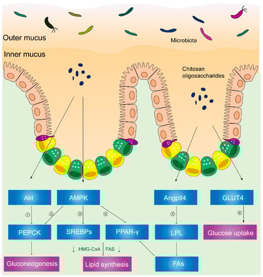 In addition, chitosan oligosaccharides reversed the decline of beneficial bacteria (e.g., phylum Verrucomicrobia) and the promotion of harmful bacteria (e.g., Proteobacteria) [119]. Furthermore, chitosan oligosaccharide treatment could decrease the microbial population of Firmicutes, Streptococcus, Bacteroides fragilis, Clostridium coccoides, C. leptum subgroup, and Eubacterium rectale in the gastrointestinal tract, especially Escherichia coli, a marker of gut dysbiosis [26]. Since various additional carbohydrate-degrading enzymes were encoded in the Bacteroidetes, compared with Firmicutes, the administration of chitosan oligosaccharides supplied an excellent growing environment for Bacteroidetes rather than Firmicutes [26]. In addition, at genus level, administration of chitosan oligosaccharides suppressed the population of Lachnospiraceae NK4A136 group, Alistipes, Helicobacter, Ruminococcus_1 and Odoribacter and upregulated the growth of Lachnospiraceae_UCG_001, and Akkermansia. It has been observed that Helicobacter pylori infection could be linked to insulin resistance, and the Lachnospiraceae NK4A136 group could serve as a distinctive marker of gut dysbiosis [122,123]. Previous research demonstrated that Akkermansia was positively correlated with serum insulin, while Alistipes, Odoribacter, and Ruminococcus were positively correlated with diabetic clinical manifestations (e.g., elevated glucose, insulin resistance, weight gain) through increased inflammatory responses via increasing TNF-α, monocyte chemoattractant protein-1 (MCP-1), and CD11c. Inflammation results in impaired gut barrier by inhibiting occluding, which constitutes cell tight conjunction, and suppressing the expression of AMP-activated protein kinase (AMPK) [124]. Recent studies have shown that AMPK activator AICAR improves intestinal epithelial development and barrier function by promoting epithelial differentiation and tight junction formation in Caco-2 cells which came from a colon carcinoma [125], suggesting the positive effects of AMPK on intestinal barrier.