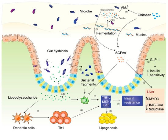 Mechanisms of chitosan in gut microbiota modulation in metabolic syndrome. ① Gut dysbiosis leads to bacterial fragment influx into blood circulation, inducing increased proinflammatory cytokines. ② Gut dysbiosis causes influx of lipopolysaccharides, which activates dendritic cells. Activated dendritic cells promote Th growth, resulting in increased proinflammatory factors (e.g., TNF-α, MCP-1, IL-1β). ③ Proinflammatory cytokines promote lipogenesis. ④ TNF-α induces insulin resistance through inhibition of sensitivity of insulin receptors. ⑤ SCFAs, metabolites of chitosan, inhibit HMG-CoA Reductase by overexpressing SMYD3. ⑥ SCFAs promote GLP-1, increasing insulin sensitivity. ⑦ Chitosan promotes the growth of Akk. Akk degrades mucins into peptides and oligosaccharides, which can be fermented by bacteria into SCFAs.