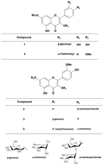 Compound 5 was yellow crystalline powder; m.p. 257 °C. Its 1H and 13C-NMR spectra (Table 1 and Table 2) showed the characteristic signals for a quercetin nucleus and a methoxy group at δH 3.87 ppm and δC 55.7 ppm. Its position was also confirmed by the upfield shift of C-2′ (δC 113.1 ppm). Two anomeric protons (δH 5.55 and 5.31 ppm; δC 101.3 and 99.4 ppm) appeared as singlets and two doublets (δH 1.13 and 0.82 ppm; δC 17.4 and 17.1 ppm) were assigned to the two methyl groups of rhamnose moieties attached to 3-OH and 7-OH, respectively. An acetyl group appeared as (3H, s) at δH 2.00 ppm, δC 20.9 and 169.9 ppm (OCOCH3). All spectral data matched a flavonol glycoside previously isolated from C. droserifolia by members of our group [11]. Thus compound 5 was identified as isorhamnetin-3-O-α-(4″- acetylrhamnoside)-7-O-α-rhamnoside (Figure 2).