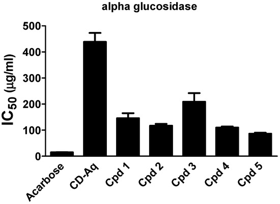 Alpha glucosidase inhibitory activity of the aqueous extract of Cleome droserifolia and the isolated compounds (1–5). Values are shown as mean ± SEM of two replicates. CD-Aq, aqueous extract; Cpd, compound.