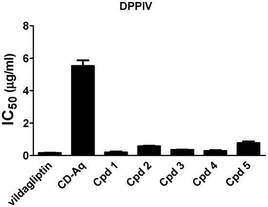 Dipeptidyl peptidase IV (DPPIV) inhibitory activity of the aqueous extract of Cleome droserifolia and the isolated compounds (1–5). Values are shown as mean ± SEM of two replicates. CD-Aq, aqueous extract; Cpd, compound.