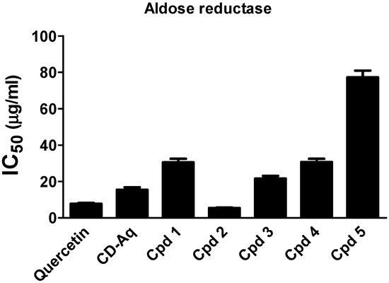 Aldose reductase inhibitory activity of the aqueous extract of Cleome droserifolia and the isolated compounds (1–5). Values are shown as mean ± SEM of two replicates. CD-Aq, aqueous extract; Cpd, compound.