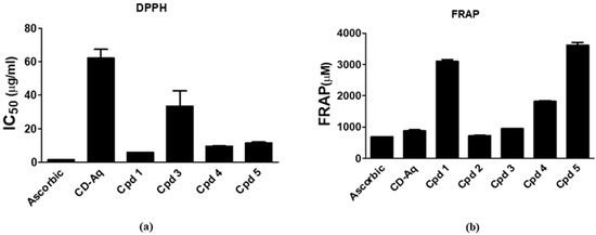 Antioxidant activity of the aqueous extract and isolated compounds from Cleome droserifolia. (a) DPPH radical scavenging. (b) Ferric reducing antioxidant power (FRAP). Values are shown as mean ± SEM of two replicates. CD-Aq, aqueous extract; Cpd, compound; DPPH, 2,2-diphenyl-1-picrylhydrazyl.