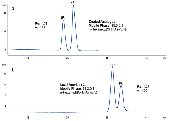 Separation of R- and S-ketoprofen mixture (1/2 ratio, w/w) on amylose tris(3-chloro-5-methylphenylcarbamate)-based chiral columns (250 × 4.6 mm, 5 µm) with coated (a) and immobilized (b) chiral selectors. Separation temperature was 25 °C, flow rate was 2 mL/min, detection was performed at 254 nm with the mobile phase composition of n-hexane:ethanol:formic acid, 95:5:0.1 (v/v/v) for the coated (a) and n-hexane:ethanol:formic acid, 98:2:0.1 (v/v/v) for the immobilized (b) chiral selector.