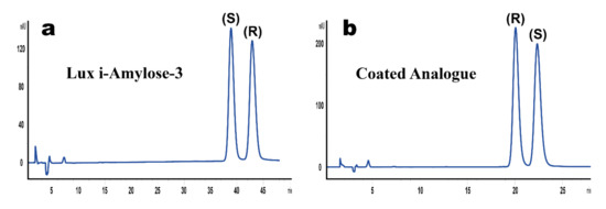 - Maisuradze, M.; Sheklashvili, G.; Chokheli, A.; Matarashvili, I.; Gogatishvili, T.; Farkas, T.; Chankvetadze, B. Chromatographic and thermodynamic comparison of amylose tris(3-chloro-5-methylphenylcarbamate) coated or covalently immobilized on silica in high-performance liquid chromatographic separation of the enantiomers of select chiral weak acids. J. Chromatogr. A 2019, 1602, 228–236. [Google Scholar] [CrossRef]