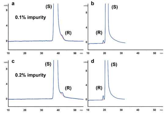 The chromatograms of two commercially available dexketoprofen 25 mg/mL injectable solutions with methods using either Lux i-Amylose-3 (250 × 4.6 mm, 5 µm) (a,c), or its coated analogue (250 × 4.6, 5 µm) (b,d). Separation temperature was 35 °C, flow rate was 2 mL/min, detection was performed at 254 nm with the mobile phase composition of n-hexane:ethanol:formic acid, 95:5:0.1 (v/v/v) for coated and n-hexane:ethanol:formic acid, 98:2:0.1 (v/v/v) for immobilized chiral selector.