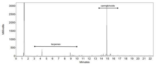 Another relatively important group of compounds in cannabis are terpenes [6,7,8,9]. Different varieties of cannabis contain mainly different monoterpenes and sesquiterpenes, which also give a distinctive scent to hemp plants. From an analytical point of view, they are interesting because their profile is often characteristic of a particular variety or population of cannabis, which may enable identification of different plant specimens [36,37]. Terpenes in cannabis are also often credited for the so-called “entourage” effect [37]. The analysis of terpenes is most often performed using gas chromatography as a separate type of analysis; successful separation and determination on different types of columns is usually quite fast, effective and simple.