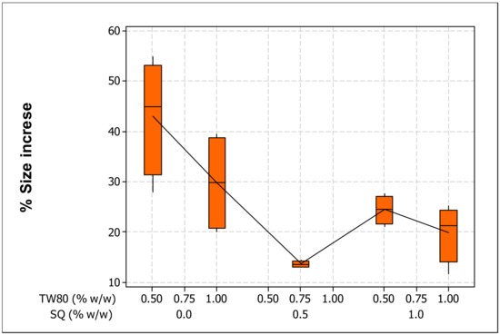 Size increase (%) of the prepared liposomes after UV exposure (280–320 nm, 6 h) affected by the effect of squalene (SQ) and Tween80 (TW80) concentrations.