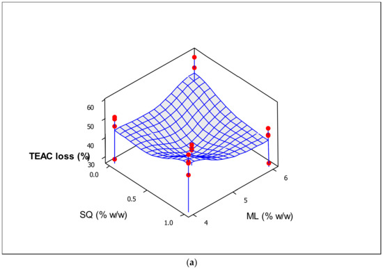 As shown in Table 4, a significant (p < 0.05) positive impact on the percentage loss of TEAC was observed for TW80 (also see Figure 2b). These results are consistent with the findings on the %size increase (shown in Table 3). Liposomes prepared in this study were composed of a mobile hydrophilic surfactant working as edge-activators and inserted into a biocompatible substrate of ML phospholipids. The important difference between surfactant-integrated liposomes and surfactant-free liposomes is the high and stress-dependent adaptability of such surfactant conjugated vesicles. This difference is demonstrated in the driving force provided by the osmotic gradient between the outer and inner layers of the liposomes. Edge activators with a high radius of curvature could obviously increase the fluidity and flexibility and enhance the deformability of the bilayers [38]. It appears that such flexible membranes are suitable for maintaining the integrity of the liposomal vesicles, engendering effective durability of the free radical scavenging system against UV-light-induced degradation. This may be because TW80 could sterically shield the lytic effect of phospholipids in the interface. From another standpoint, when exposed to UV light, phospholipids may be readily exchanged with the environment. TW80 is viscous and may minimize the exchange of phospholipids from the interfacial region. Moreover, the higher amount of TW80 could help in the wetting and dispersion of the very hydrophobic SQ molecules and enhance its solubility [39]. Thus, DPPH could easily capture H+ atoms from the SQ in such systems that are exposed to UV light.