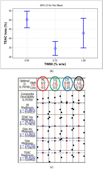 Trolox equivalent antioxidant capacity (TEAC) loss (%) of the prepared liposomes against UV light (280–320 nm, 6 h) affected by the (a) combined effects of mixed soy lecithin (ML) and squalene (SQ) concentrations and (b) effect of Tween80 (TW80) concentration, and (c) multiple response optimizer showing the optimum concentrations of (5% (w/w) mixed soy lecithin (ML), 0.5% (w/w) squalene (SQ), 0.3% (w/w) cholesterol (CH) and 0.75% (w/w) Tween80 (TW80)) in order to achieve the maximum zeta potential (ZP) and trolox equivalent antioxidant capacity (TEAC), minimum particle size and loss of TEAC, and minimum increase in size.