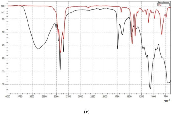 FTIR spectra showing (a) SQ-loaded liposome (5% (w/w) mixed soy lecithin (ML), 0.5% (w/w) squalene (SQ), 0.3% (w/w) cholesterol (CH) and 0.75% (w/w) Tween80 (TW80)), (b) overlap spectra of squalene (SQ)-loaded (black) and squalene (SQ)-free liposomes (5% (w/w) mixed soy lecithin (ML), 0.3% (w/w) cholesterol (CH) and 0.75% (w/w) Tween80 (TW80)) (red) and (c) overlap spectra of pure SQ (red) and SQ-loaded liposome (black).
