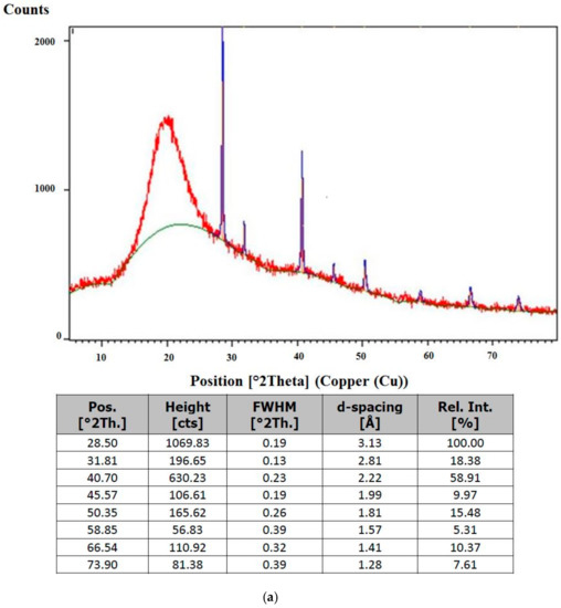 The XRD patterns of the optimal SQ-liposome and its control counterpart (without SQ) are presented in Figure 4a,b, respectively. Basically, the peak position, peak width and peak intensity are considered as significant peak shape attributes in XRD. Accordingly, peak lists of the liposome samples are illustrated in Figure 4a, b to identify these factors accurately. The positions of diffraction peaks and the d-spacings that they represent provide information about the location of the lattice planes in the crystal structure. Each peak measures a d-spacing that represents a family of lattice planes. Each peak also has an intensity which differs from other peaks in the pattern and reflects the relative strength of the diffraction. In a diffraction pattern, the strongest peak is, by convention, assigned an intensity value of 100, and the other peaks are scaled relative to that value. Variations in the measured intensity are chiefly related to variations in the scattering intensity of the components of the crystal structure and their arrangement in the lattice. Some of the most dramatic variations are related to interference between the diffractions produced within the lattice, and these diffractions can produce systematic extinctions or greatly reduced intensities of peaks from certain lattice planes. Peaks with such a broad hump (a high full width at half maximum (FWHM) or a decrease of peak height) have a well-known confirmed characteristic phase which is amorphous or poorly crystalline in nature [41]. In addition, according to Li et al. [42], an amorphous precipitate presents a halo in the diffractogram without defined peaks due to the disordered arrangement of drug molecules in an amorphous form.