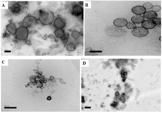 TEM micrographs of liposomes (scale bar: 200 nm): (A) control of optimized formulation (5% (w/w) mixed soy lecithin (ML), 0.3% (w/w) cholesterol (CH) and 0.75% (w/w) Tween80 (TW80)), (B) optimized squalene (SQ)-loaded liposomes (5% (w/w) mixed soy lecithin (ML), 0.5% (w/w) squalene (SQ), 0.3% (w/w) cholesterol (CH) and 0.75% (w/w) Tween80 (TW80)), (C) control of optimized formulation exposed to UV, (D) optimized squalene (SQ)-loaded liposomes exposed to UV light (280–320 nm, 6 h).