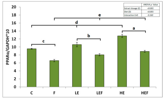 The mRNA expression of peroxisome proliferator-activated receptor α (PPARα) in the livers of rats fed experimental diets: the values are the means ± SEMs. To indicate a significant effect (at p < 0.05) of the extract dosage, bars were marked with the letters a, b, or c, whereas to present an effect of different types of diet, bars were marked with the letters d or e. C, control fed a diet with 53% corn starch; F, fed a diet with 14% pam oil added at the expense of corn starch; LE, fed a C-diet with a strawberry ET-rich extract at a low dosage of 0.24% of the diet; LEF, fed an F-diet with a strawberry ET-rich extract at a low dosage of 0.24% of the diet; HE, fed a C-diet with a strawberry ET-rich extract at a high dosage of 0.72% of the diet; and HEF, fed an F-diet with a strawberry ET-rich extract at a high dosage of 0.72% of the diet.