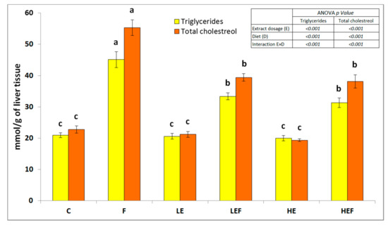 The hepatic level of cholesterol and triglycerides of rats fed the experimental diets: the values are the means ± SEMs. Mean values not sharing the same superscript letter within bars (a, b, or c) are different at p < 0.05. C, control fed a diet with 53% corn starch; F, fed a diet with 14% pam oil added at the expense of corn starch; LE, fed a C-diet with a strawberry ET-rich extract at a low dosage of 0.24% of the diet; LEF, fed an F-diet with a strawberry ET-rich extract at a low dosage of 0.24% of the diet; HE, fed a C-diet with a strawberry ET-rich extract at a high dosage of 0.72% of the diet; and HEF, fed an F-diet with a strawberry ET-rich extract at a high dosage of 0.72% of the diet.