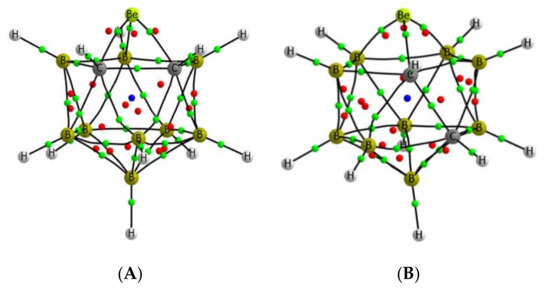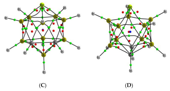 Molecular graph for the four isomers of the beryllium ortho-carboranes investigated. The location of the bond, ring, and cage critical points is indicated with green, red, and blue dots, respectively. A–D the same as in Figure 2.