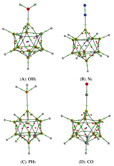 In order to understand and rationalize how the different dodecaboranes may interact with the selected set of Lewis bases, we will firstly analyze the isolated dodecaboranes. The four isomers with general formula B9H11C2Be considered in this article show an icosahedral shape (Figure 3). Only isomer A has been described in the literature [26]. The relative enthalpy of the four isomers is listed in Table 1. The most stable isomer D is the one with the maximum distance between the carbon and beryllium atoms, whereas isomer A, which exhibits the shortest distance between those atoms, lies 18 kJ·mol−1 higher in energy (see Table 1). The other two isomers, C and B, show relative energies of 29 and 35 kJ·mol−1, respectively. Thus, no clear relationship is observed between the relative stability of the isomers and the distribution of the atoms in the icosahedral structure of the molecule.