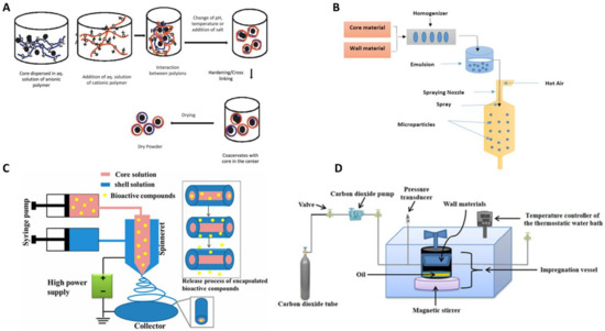 Schematic representation of the micro/nanoencapsulation process by (A) complex coacervation, (B) spray-drying, (C) coaxial electrospinning and (D) supercritical fluid technology (image adapted from [31,34,45,54]).