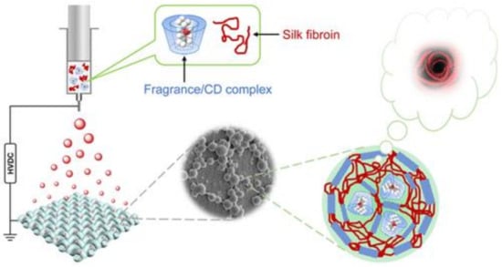 Textiles represent one of the most investigated applications for micro- and nanospheres/capsules encapsulating fragrances and aromas. These encapsulated volatile compounds have been employed for several years in textile-finishing processes, such as fabric conditioners to impart freshness and odour control [104,105,106,107]. Through encapsulation, fragrances are retained and released for a long time [108]. Moreover, the sensation of the added encapsulated fragrances can be preserved also after several washing-drying cycles (up to 25); therefore, the attractiveness of the product to the consumers is improved [109,110]. Encapsulated perfumes and EOs have been added in scarves, ties, lingerie and other garments, as well for home textiles, such as sofa coverings, curtains and cushions for aromatherapy [106,111]. Perfumes and aromas can be directly applied on textiles; however, their scarce affinity to fabric fibres and their chemical volatility limit their permanence. Thus, encapsulation promotes a prolonged duration of aroma sensations due to the controlled release of the fragrance. For this purpose, several types of fabrics can be processed with encapsulated fragrances and aromas, such as cotton, silk and synthetic fibres (polyamide or polyester). These micro- and nanocapsules/spheres can be added to textiles using different techniques, such as impregnation, spraying, coating or stamping [103,112]. The encapsulation of fragrances and aromas is still achieved through traditional methods such as simple or complex coacervation, as well as the inclusion encapsulation method or interfacial polymerisation. However, other “innovative” encapsulation processes for fragrances and aromas have been recently explored in textile applications. Ye et al. proposed an electro-spraying method using aqueous media to prepare composite nanospheres made up of silk fibroin and β-CD encapsulating rose oxide or D-limonene (Figure 2). The nanospheres have an aroma encapsulation higher than 90% and were deposited directly on silk fabric. The fragrances were released with zero-order kinetics, guaranteeing a low rate and constant release profile. Noticeably, the composite nanospheres were retained at a higher percentage (more than 80%) after 10 runs of washing with water, demonstrating its applicability in the textile field [113].