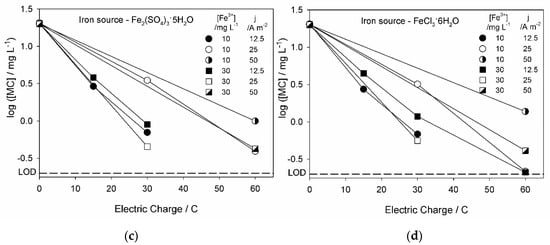 Figure 1 presents the logarithm of the MC concentration decay with time (Figure 1a,b) for the EF experiments performed with different iron sources and concentrations and applied anodic current densities. A logarithmic scale was chosen because MC concentration decay was very abrupt during the first minutes of the assay. MC concentration decay was also analyzed as a function of the applied electric charge (Figure 1c,d), so conclusions could be drawn regarding the energetic efficiency of the EF process at the different experimental conditions.