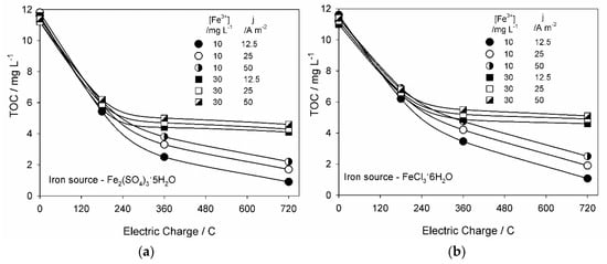 Total organic carbon (TOC) decay with applied charge for the EF experiments performed with (a) Fe2(SO4)3·5H2O and (b) FeCl3·6H2O, at different iron concentrations and applied current densities.