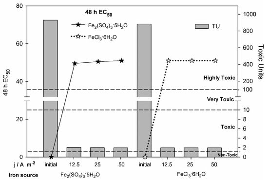 Since MC is a highly toxic compound and the presence of iron salts can also contribute to solution´s toxicity, the ecotoxicity of the initial and treated solutions was evaluated towards D. magna, a freshwater crustacean whose utilization as a model species in ecotoxicological tests is recommended by American Society for Testing and Materials (ASTM), Organization for Economic Cooperation and Development (OECD), and International Organization for Standardization (ISO). In fact, methiocarb (an acetylcholinesterase inhibitor pesticide, widely used in agriculture as a molluscicide, acaricide, and avicide) has already been studied in regards of its toxicity towards aquatic invertebrates [27]. Attending that, at the end of EF treatment, no methiocarb was detected in any of the experiments performed, and the higher TOC removals were achieved by the solutions containing 10 mg L−1 of iron—only solutions prepared with this iron amount were ecotoxicologically evaluated. Figure 4 presents the ecotoxicity results, in terms of EC50 and toxic units, after 48 h of exposure, of the MC solutions prepared with 10 mg L−1 of iron, before and after the EF treatment at the different j studied, at the applied electric charge of 720 C. Results show that EF treatment of methiocarb solutions led to a remarkable decrease in the acute toxicity towards D. magna. No meaningful differences were found in the ecotoxicity results of the treated samples evaluated. For iron sulfate-containing solutions, the increase in EC50 was from 0.108% to 50.4%, on average, corresponding to an average toxicity reduction of 468×, from 929.4 TU to 1.99 TU. For the experiments performed with added ferric chloride, an increase in EC50 from 0.113% to 51.01% was achieved, corresponding to a toxicity reduction of 450×, from 883.1 TU to 1.96 TU. These results demonstrate the high EF treatment efficiency for MC toxicity removal. The MC solutions with added iron sulfate or ferric chloride, classified as highly toxic before the EF assay, became only toxic after the treatment and was almost considered non-toxic (TU < 1), according to the toxicity classification based on toxic units reported by Pablos et al. [24].
