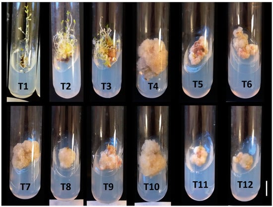 In the treatments without the addition of phytoregulators, and in the treatments containing only 1 or 2 mg/L BA, without the addition of 2,4-D, there was no callus formation in darkness conditions (Table 1). In contrast, the addition of BA, even in dark conditions, resulted in the development of multiple shoots (Figure 1—T2 and T3).