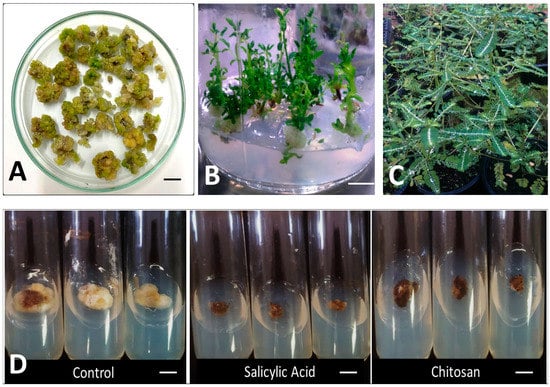 Green callus obtained with BA and lighting conditions (A); micropropagated plantlets under in vitro (B) and acclimatized under greenhouse conditions (C); effects of salicylic acid and chitosan on callus elicitation obtained with 2,4-D (0.50 mg/L) and darkness conditions (D) (bars = 1.0 cm).