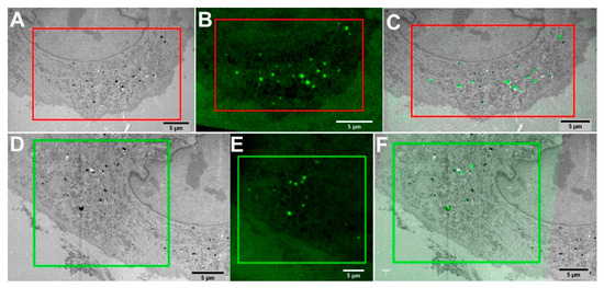 The green FNDs based CLEM method for multimodal image correlation was performed with a dedicated software plugin “eC-CLEM” [84]. The LM images were preprocessed to enhance brightness and contrast with ImageJ, and prealigned to match orientation with TEM images. The efficiency and precision of a non-rigid image correlation can be enhanced by maximizing the number of fiducial landmarks available for correlation with both modalities. We used 10–19 FNDs fiducial landmarks in our CLEM experiments, which resulted in a highly precise image correlation. In Figure 3A,B, the corresponding green FNDs (red boxes) from LM and TEM were matched by selecting individual green FNDs in the automatic mode of eC-CLEM. In Figure 3C, the overlay of correlated LM and TEM images is shown. The ROIs (green and red boxes) from TEM (Figure 1B) and LM (Figure 2E) were matched point-by-point using green FNDs as fiducials to generate a highly precise overlay. Similarly, ROI (green boxes) in Figure 3D,E were matched using common green FNDs as landmarks. The results of the image correlation of Figure 3D,E is shown in Figure 3F.