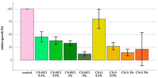 Before the analysis of the antifungal properties of polymethyl methacrylate (PMMA) resins modified with chitosan (CS)-salts, the antifungal capacity of each CS-salt was determined. The analysis of relative growth showed that there was a good antifungal effect of both CS-salts. The relative fungal growth was decreased by CS-salts significantly in all groups compared to the control group (Figure 1).