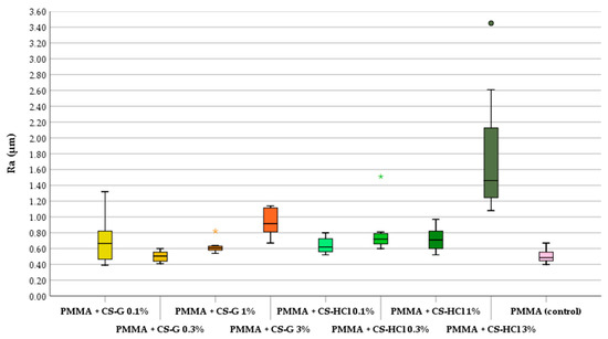 CS-salt powder particles can be identified on the specimen’s surface. This changes the aesthetic appearance of the material. The amount of CS-salt particles increases with a rising concentration of CS-salts added to the PMMA. The results of the contact profilometry showed that the surface roughness increased by adding CS-salts to the denture resin material (Figure 2). A significant increase in roughness (p ≤ 0.05) compared to the unmodified material was found when adding 1%, 3% CS-G and 0.1%, 0.3%, 1% and 3% CS-HCl to the PMMA material.