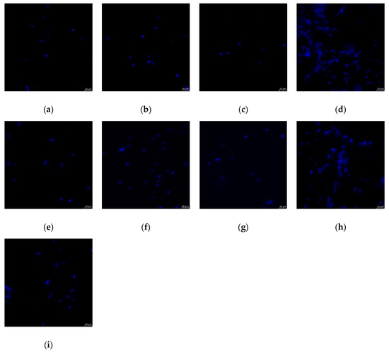 Exemplary epifluorescence microscopic images of C. albicans cells on specimens in each group: (a) PMMA + CS-G 0.1%, (b) PMMA + CS-G 0.3%, (c) PMMA + CS-G 1%, (d) PMMA + CS-G 3%, (e) PMMA + CS-HCl 0.1%, (f) PMMA + CS-HCl 0.3%, (g) PMMA + CS-HCl 1%, (h) PMMA + CS-HCl 3%, (i) PMMA (control); polymethylmethacrylate (PMMA), chitosan glutamate (CS-G), chitosan-hydrochloride (CS-HCl).