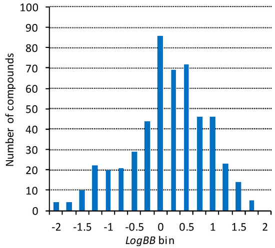 Both our experience and the literature data [64,65,66,67] show that the completeness and accuracy of the training sets play a critical role in developing predictive and widely applicable QSAR/QSPR models. We have compiled a dataset based on the open quantitative (LogBB) data that was significantly extended and more complete compared to the largest sets published at the time. More than 100 source publications were included. Unfortunately, the quality of the available literature data has not significantly improved in the almost two decades since the analysis [68] was published. During the preparation of the dataset, the data were verified and the errors in structures and endpoint values corrected against the original publications. On the other hand, inorganic molecules irrelevant to medicinal chemistry were excluded. The final dataset used in the modeling contains 529 diverse organic compounds, with LogBB values ranging from −2.15 to 1.70 (the full dataset with literature references is provided in the Supplementary Materials). The plot of the LogBB value distribution (Figure 1) confirms representative coverage of the entire endpoint range.