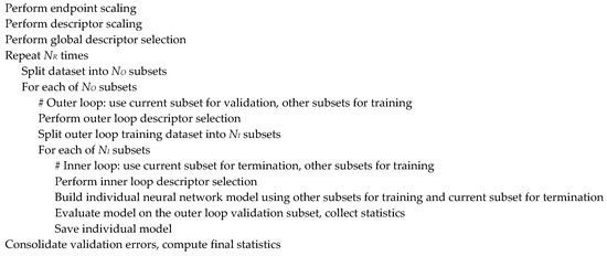The high-level modeling workflow shown in Figure 2 integrates the classical feed-forward back-propagation neural network (BPNN) architecture and the repeated double cross-validation [70] approach. The double cross-validation procedure involves two loops and in each loop a fraction of the dataset is randomly selected as a test subset. During each iteration of the inner loop, a neural network model is built using the training subset while the prediction error on the test subset is monitored to provide the early termination, while the outer loop test subset is used to validate the resulting model. Usually the 5 × 4-fold double cross-validation scheme is employed, corresponding to and in Figure 2. That is, in the outer loop the dataset is split into five subsets of approximately equal sizes, and each of them is used to validate four models built in the inner loop by splitting the remaining data into four subsets of approximately the same size and using three of them for training the model and one for early termination. The procedure can be repeated several times () to enhance the stability and reliability of the results. The validation subset errors are then consolidated and normalized into the usual cross-validation statistics such as the parameter and the root mean squared error