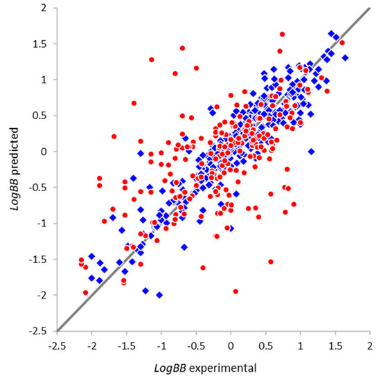 As explained in Section 2.1, external validation of the model was performed using the extensive dataset compiled by Brito-Sánchez et al. [26]. Among the 568 compounds with reasonable LogBB values, 216 compounds were not present in our training dataset. Their distribution is very similar, with LogBB values ranging from −2.15 to 1.60. The prediction using our model was successful for 564 compounds (213 non-overlapping compounds). The prediction results are shown in Figure 5 in terms of the experimental (dataset) and predicted LogBB values. It can be seen that the agreement between them is generally good for most of the compounds both in the overlapping and non-overlapping subsets (the statistical parameters are listed in Table 1).