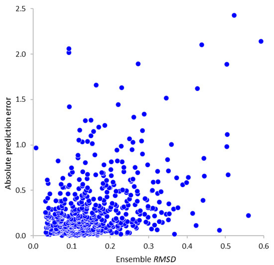 Using this validation dataset, we also attempted to evaluate to what extent the standard deviation values from the ensemble prediction procedure (Section 2.3.4) could be used as a predictor of resulting prediction errors, and thus as a measure of model applicability. The plot in Figure 6 reveals a loose correlation between these quantities () and indicates that very high prediction errors are indeed much more likely to occur for the compounds with greater ensemble standard deviations (reflecting substantial differences between individual neural network models based on different subsets of training data). However, the accuracy of this test is not sufficient for it to be used as a strict prediction acceptability filter, providing instead just a warning of potential problems.
